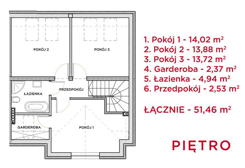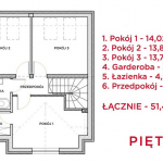 I piętro: Pokój 1 14,02 m2, Pokój 2 13,88 m2, Pokój 3 13,72 m2, Łazienka – 4,94 m2, Przedpokój 2,92 m2