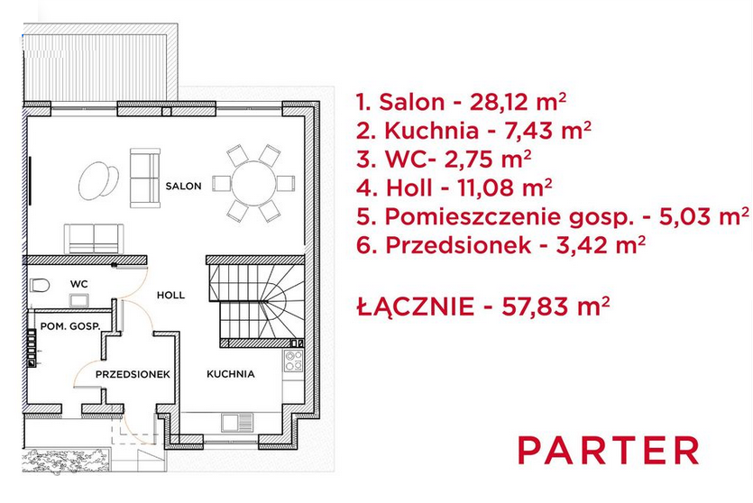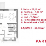 Parter:Salon 28,12 m2, Kuchni 7,43 m2, Holl 11,08 m2